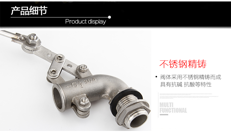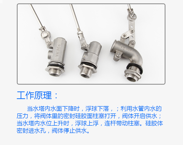 當水塔內(nèi)水面下降時,浮球下落,;利用水管內(nèi)水的壓力,將閥體里的密封硅膠面柱塞打開,閥體開啟供水;當水塔內(nèi)水位上升時,浮球上浮,連桿帶動柱塞。硅膠體密封進水孔,閥體停止供水。