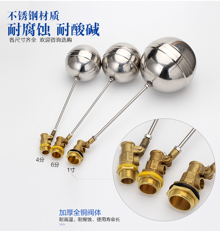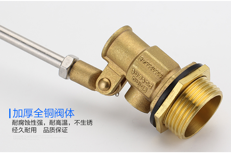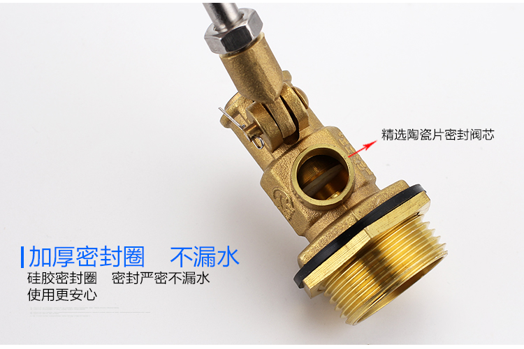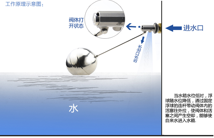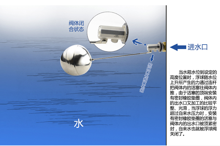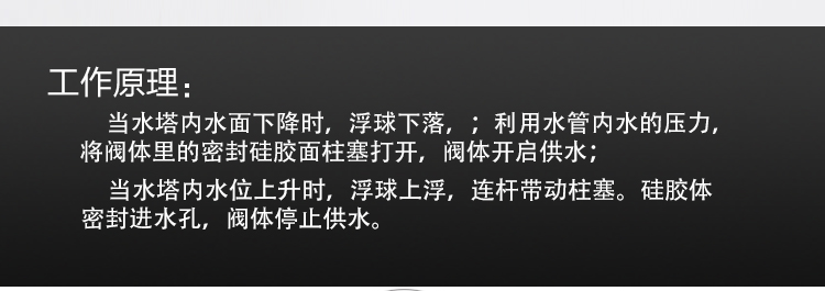 當(dāng)水塔內(nèi)水面下降時(shí),浮球下落,利用水管內(nèi)水的壓力,將閥體里的密封硅膠柱塞打開(kāi),閥體開(kāi)啟供水,當(dāng)水塔水位上升時(shí),浮球上浮,連桿帶動(dòng)柱塞,硅膠體密封進(jìn)水孔,閥體停止供水.