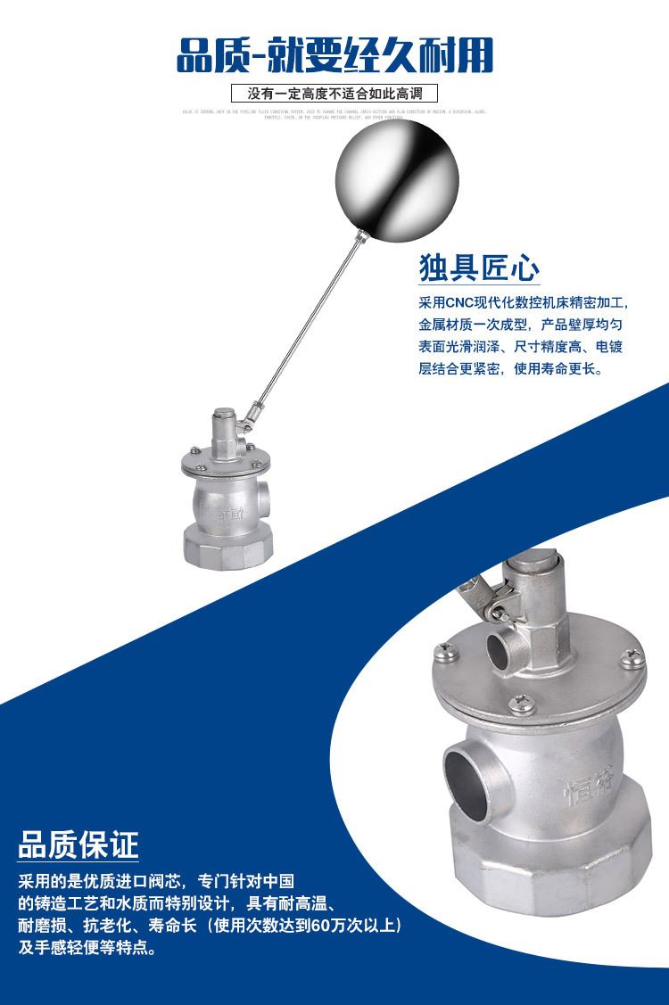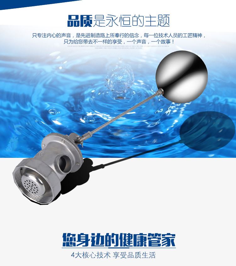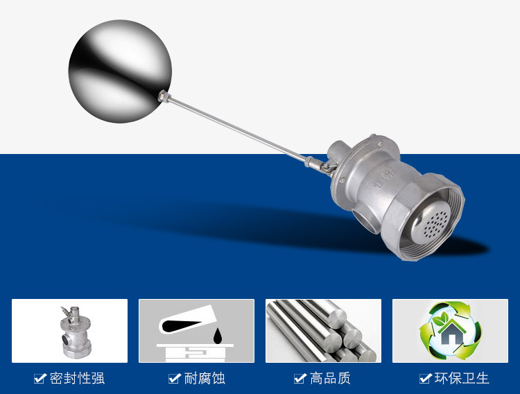 當水塔內(nèi)水面下降時,浮球下落,利用水管內(nèi)水的壓力,將閥體里的密封硅膠柱塞打開,閥體開啟供水,當水塔水位上升時,浮球上浮,連桿帶動柱塞,硅膠體密封進水孔,閥體停止供水.