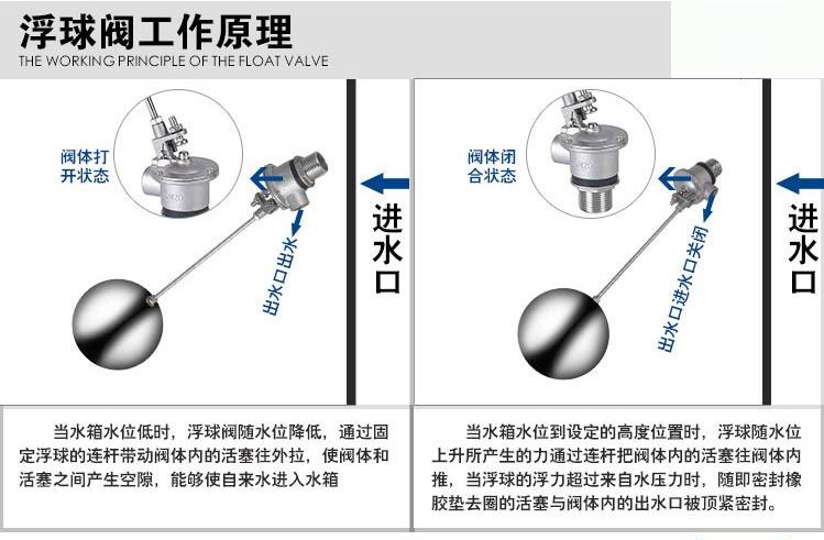 當水塔內(nèi)水面下降時,浮球下落,利用水管內(nèi)水的壓力,將閥體里的密封硅膠柱塞打開,閥體開啟供水,當水塔水位上升時,浮球上浮,連桿帶動柱塞,硅膠體密封進水孔,閥體停止供水.