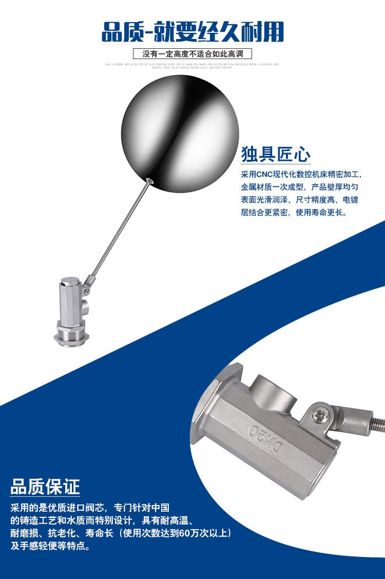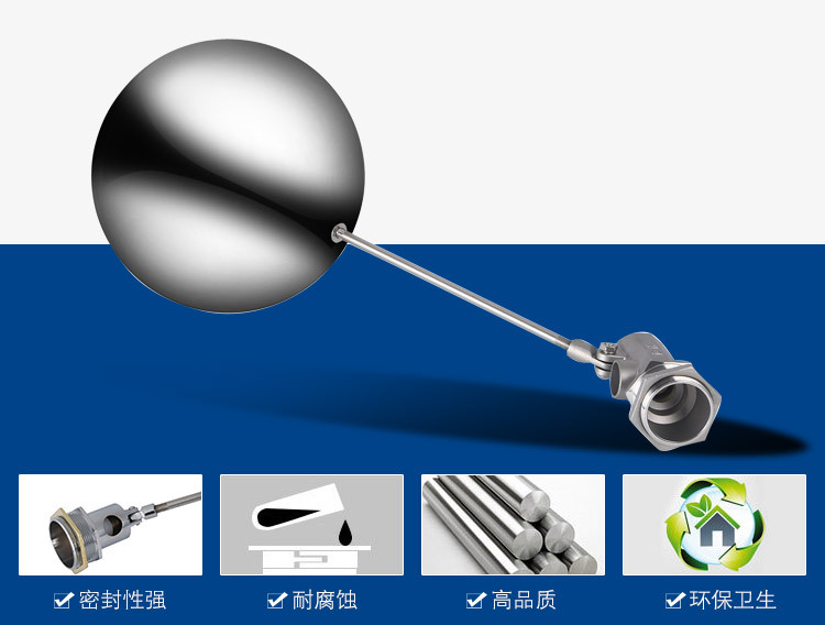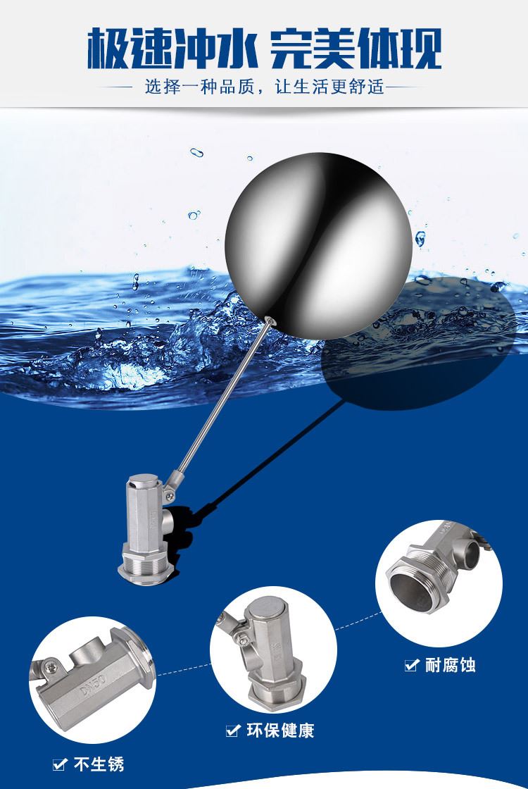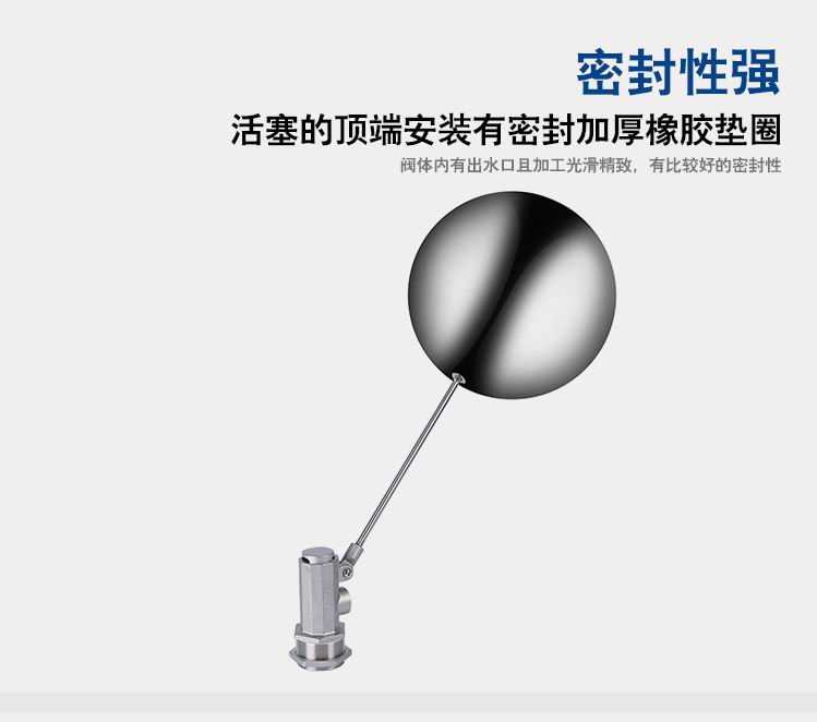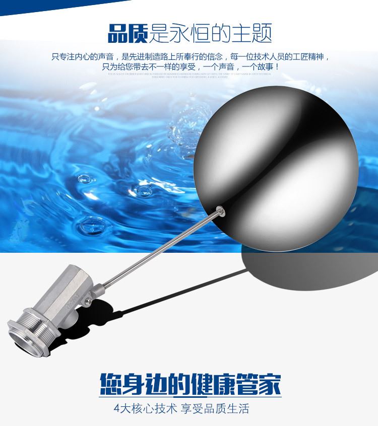 當(dāng)水塔內(nèi)水面下降時(shí),浮球下落,利用水管內(nèi)水的壓力,將閥體里的密封硅膠柱塞打開(kāi),閥體開(kāi)啟供水,當(dāng)水塔水位上升時(shí),浮球上浮,連桿帶動(dòng)柱塞,硅膠體密封進(jìn)水孔,閥體停止供水.