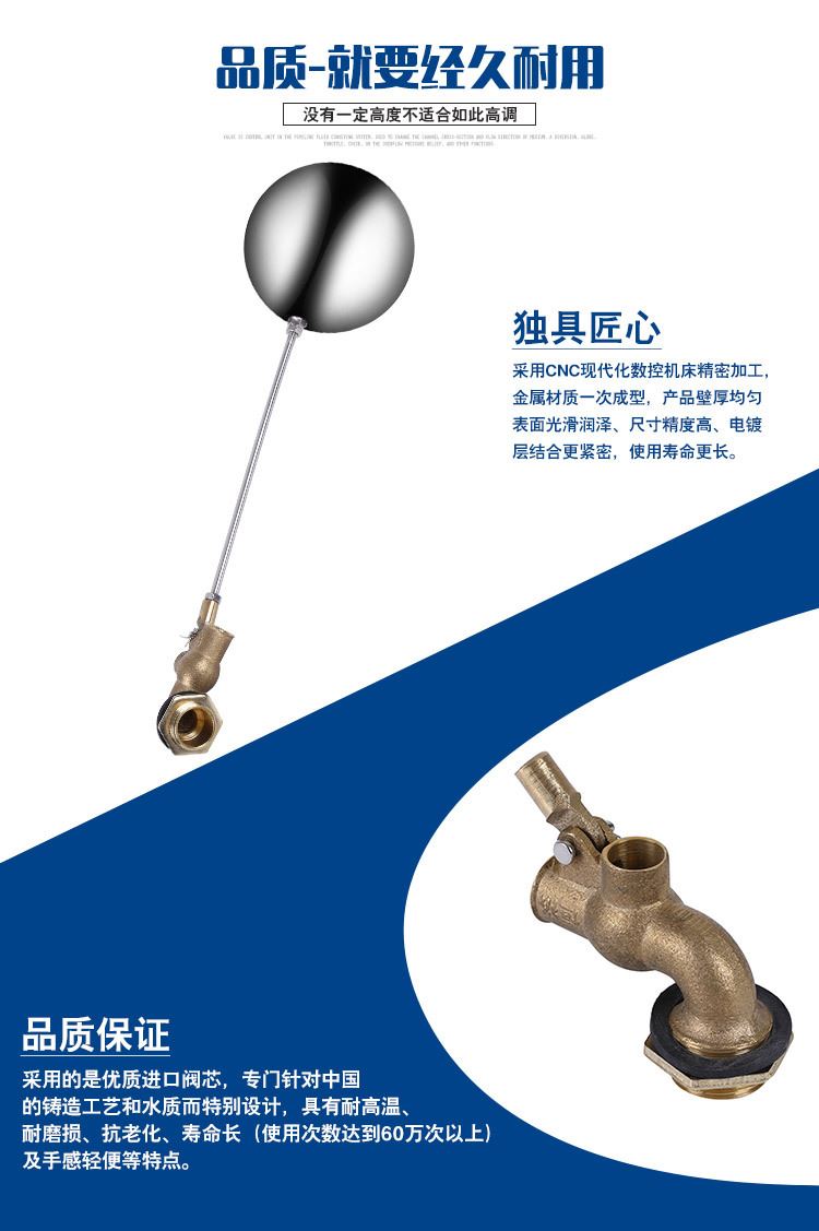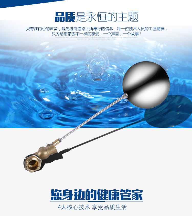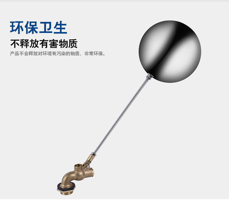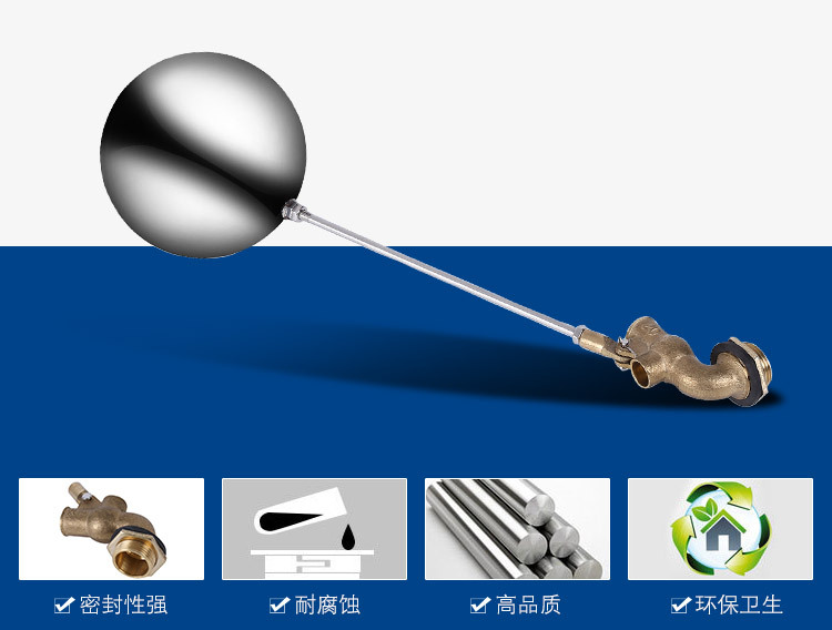 當(dāng)水塔內(nèi)水面下降時,浮球下落,利用水管內(nèi)水的壓力,將閥體里的密封硅膠柱塞打開,閥體開啟供水,當(dāng)水塔水位上升時,浮球上浮,連桿帶動柱塞,硅膠體密封進水孔,閥體停止供水.